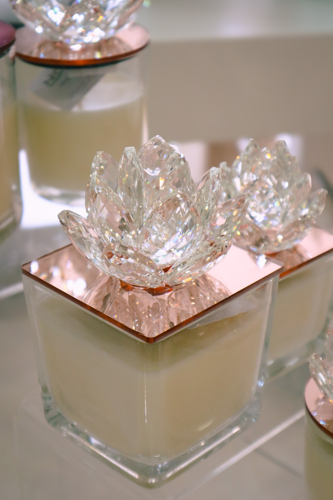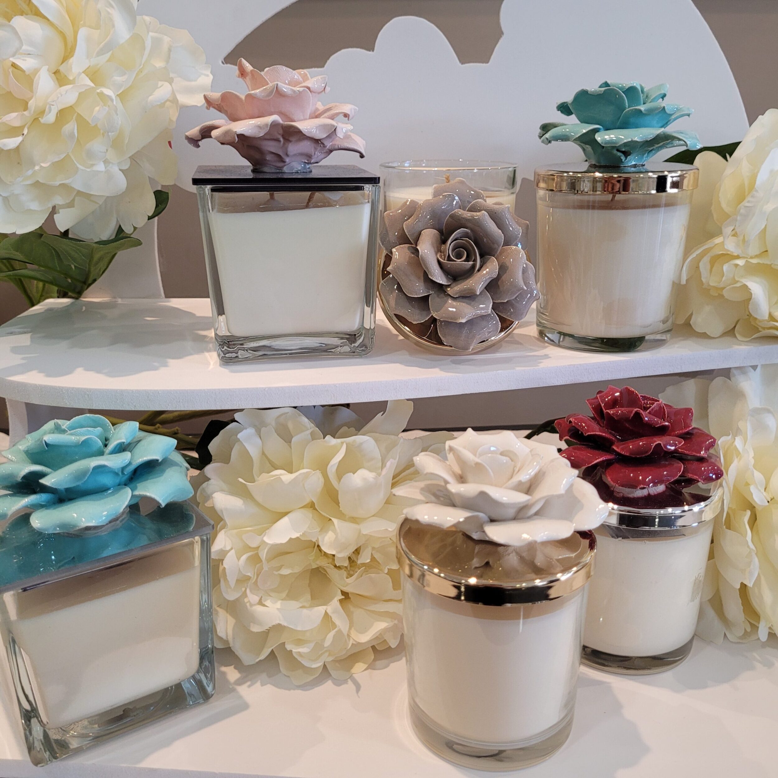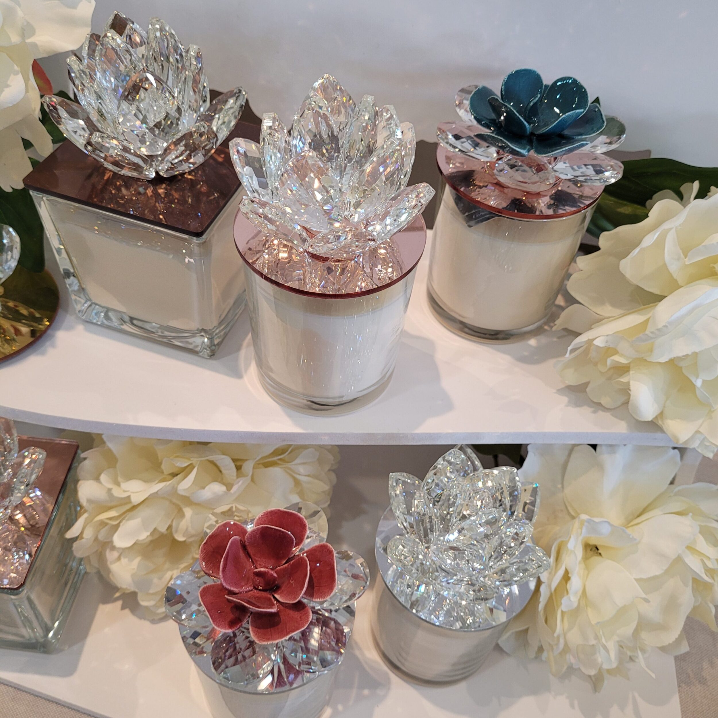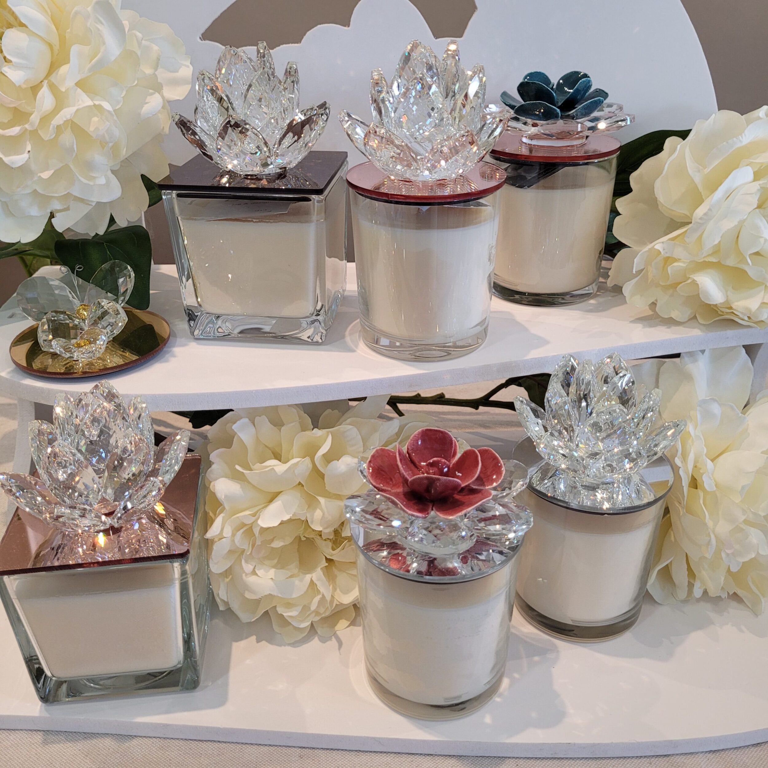 Ultimissima creazione: candele in cera di soia, super profumate, con coperchio a specchio e decoro in vetro o in porcellana colorata.